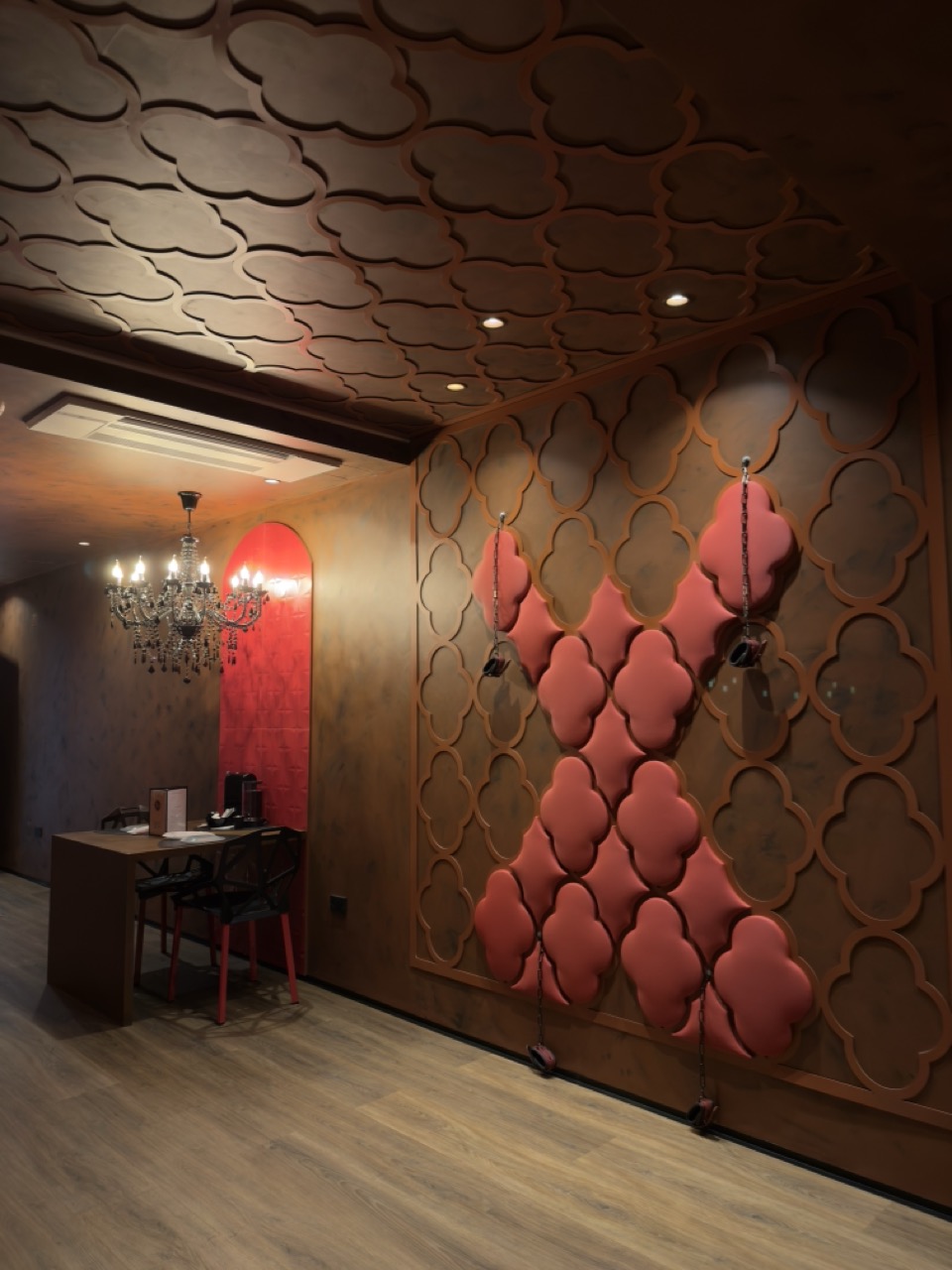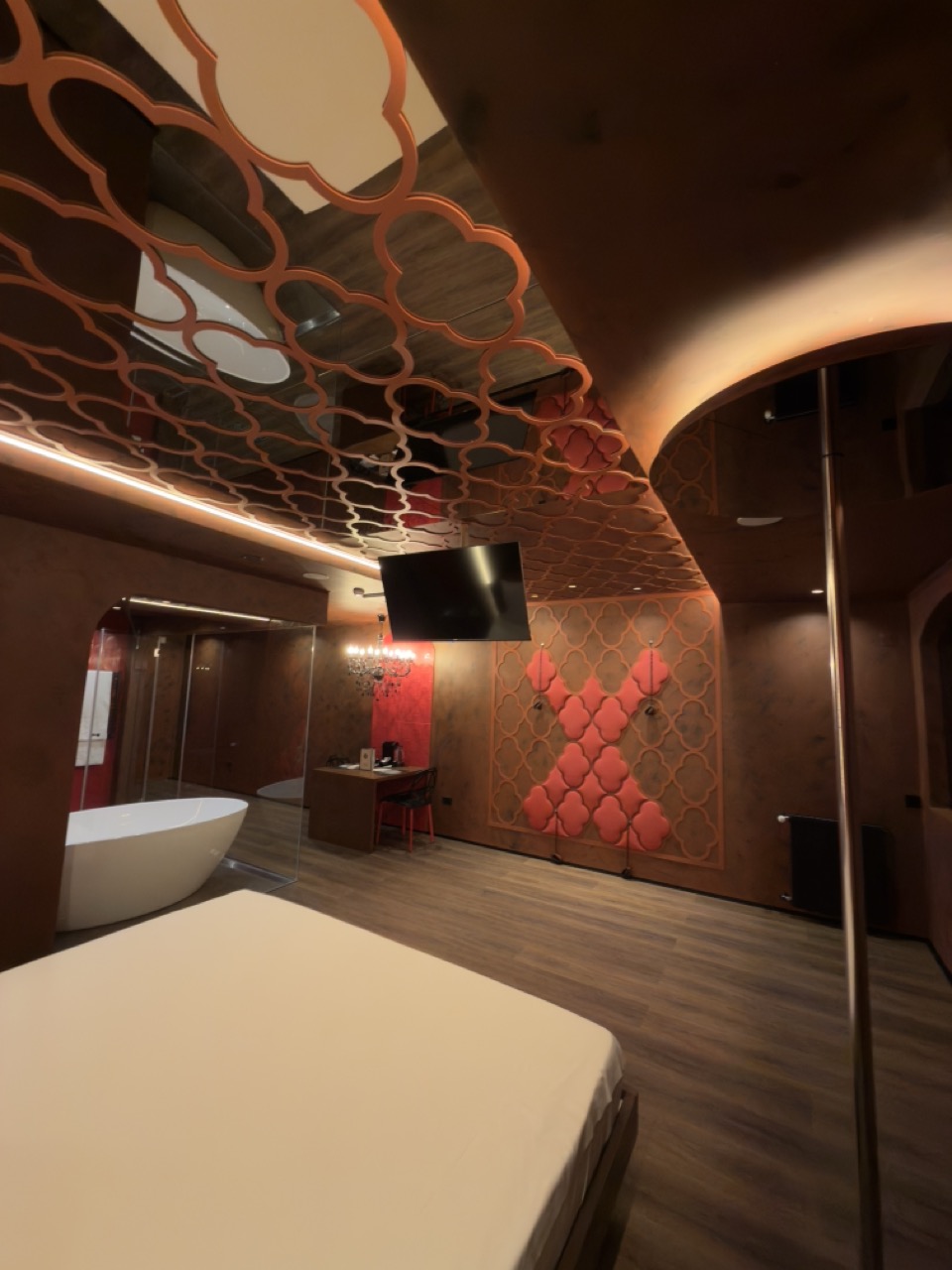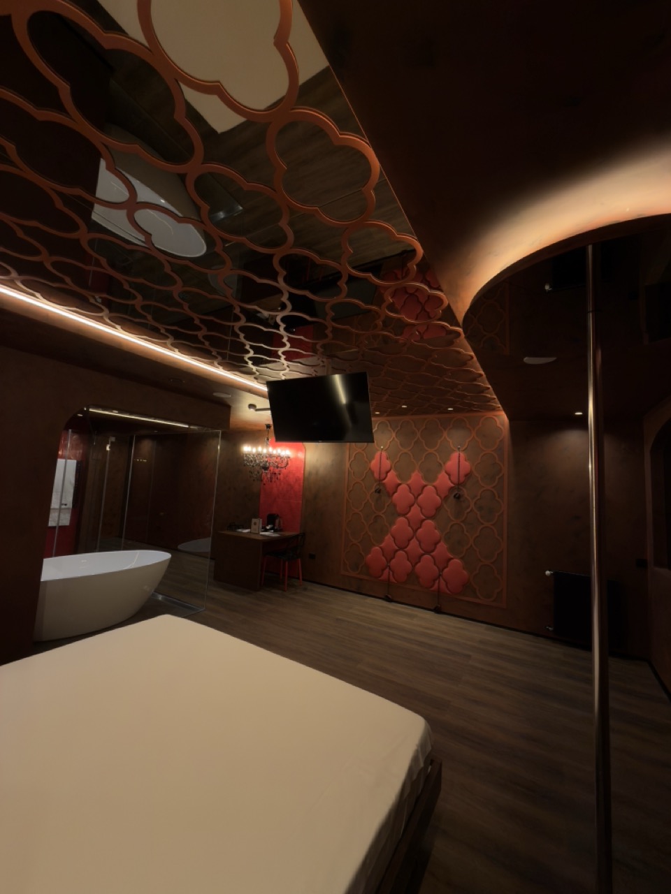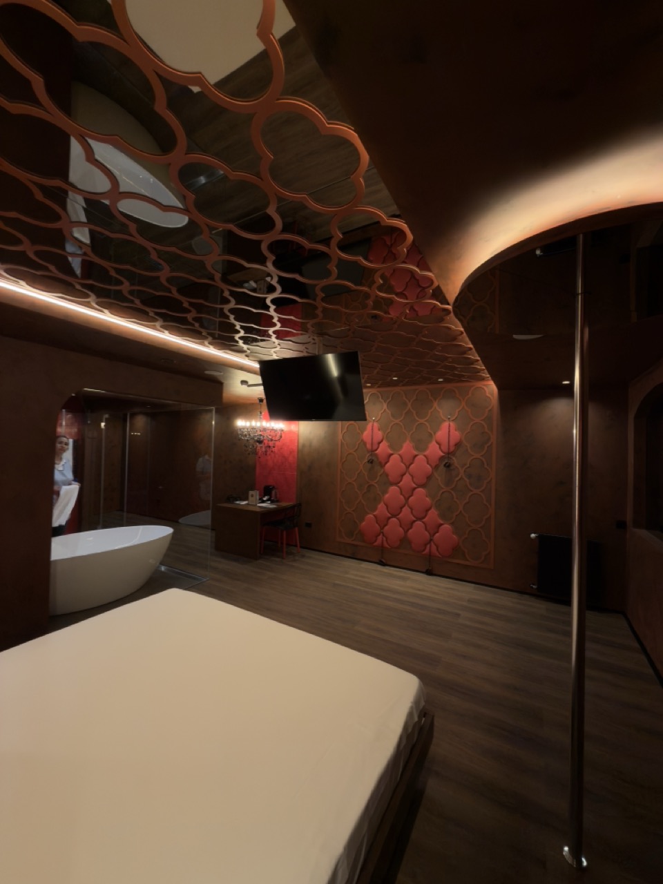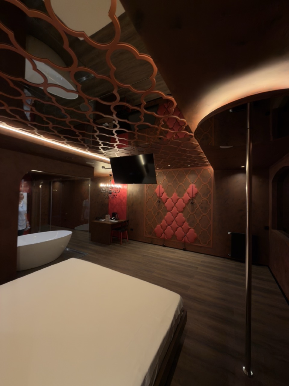 Para quem procura explorar novas sensações, a Suite Obsession dispõe de um varão integrado no espaço e de algemas fixas na parede, pensadas para serem utilizadas e acrescentarem um lado mais ousado e intenso à experiência.